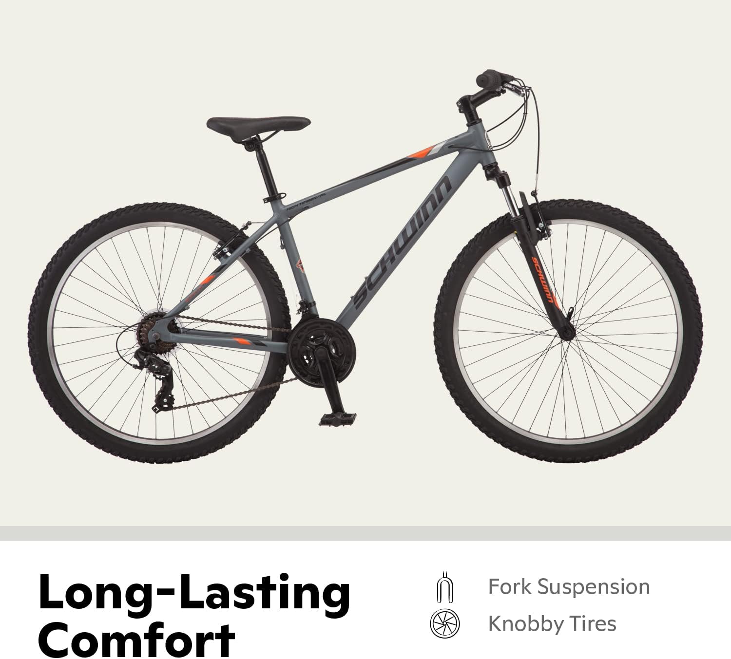 Save big on Schwinn High Timber Mountain Bike for Adult Youth Men Women Boys Girls, 24 to 29-Inch Wheels, 7 or 21-Speeds, Front Suspension, Aluminum and Steel Frame Options(Grey) and accessories during our BOGO sale. Buy one, get one 50% off!
