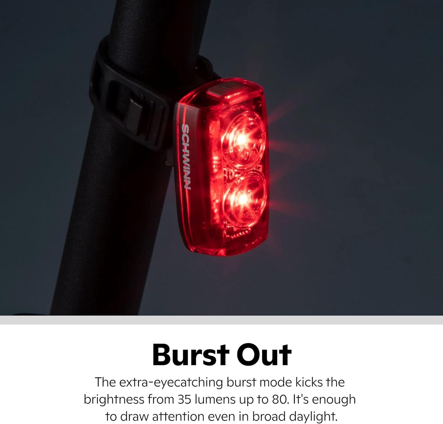 Schwinn USB Rechargeable Taillight, Daytime Running Light, 25-80 Lumen, Taillight with Steady, Flash and Burst Modes, Easy to Install, USB-C Charging, for City and Road Riding